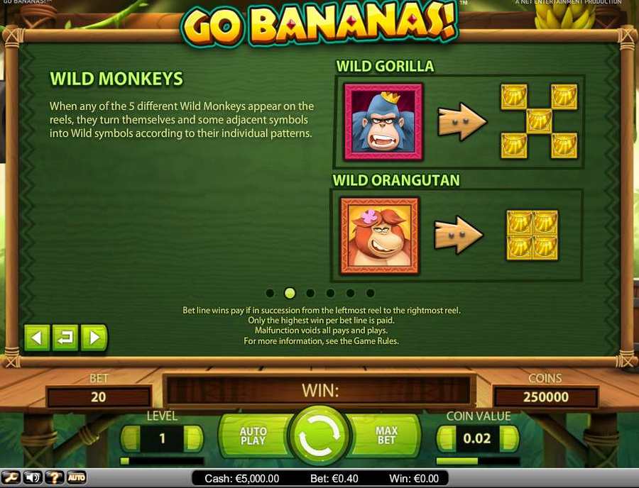 Go Bananas is a fast-paced slots game but there are few Bonus Features to distract players from the 5 reels as they spin. Yet the 6 Monkey Wild symbols that can be found provide numerous chances for players to add to their winnings. They can all change other symbols in different ways to create more winning combinations which then are included in the final jackpot amount.