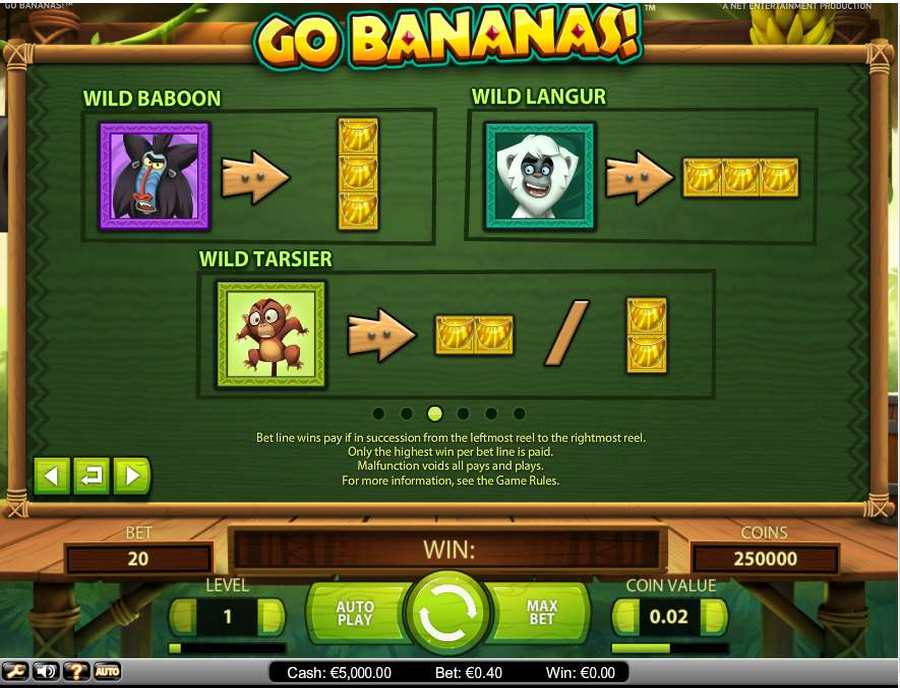 There are 20 winning pay-lines included in the Go Bananas slots game and players can place up to 10 coins on each should they wish to. The coin denomination begins at just $0.01 and only rises to $1.00. This makes the game popular with both high and low rollers who enjoy Net Entertainment online casinos.